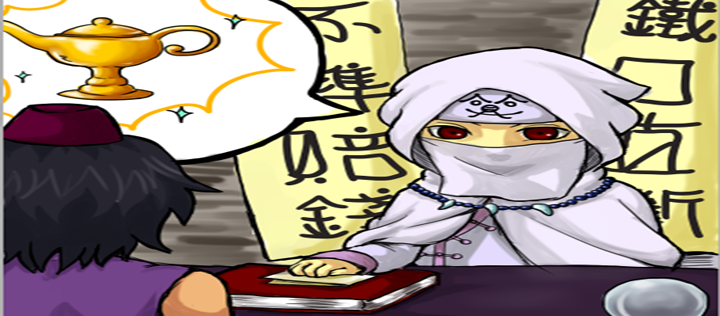 「兄弟,老實告訴你吧,我就是這個神燈的精靈。」白衣算命師昂起頭,一臉欠抽地模樣俯視一臉便秘的阿拉丁。「為了感謝你不辭辛勞幫我找到了我的本體,我可以幫你實現三個願望!這次我大慈大悲只收兩萬台幣就好了喔!」