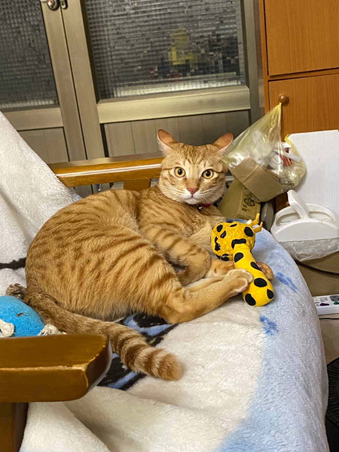 以前花花睡在一張椅子上,上面會舖上史努比的厚毛毯。他都睡在那上面。旁邊還有IKEA的長頸鹿和一隻藍色可發生小象陪著。