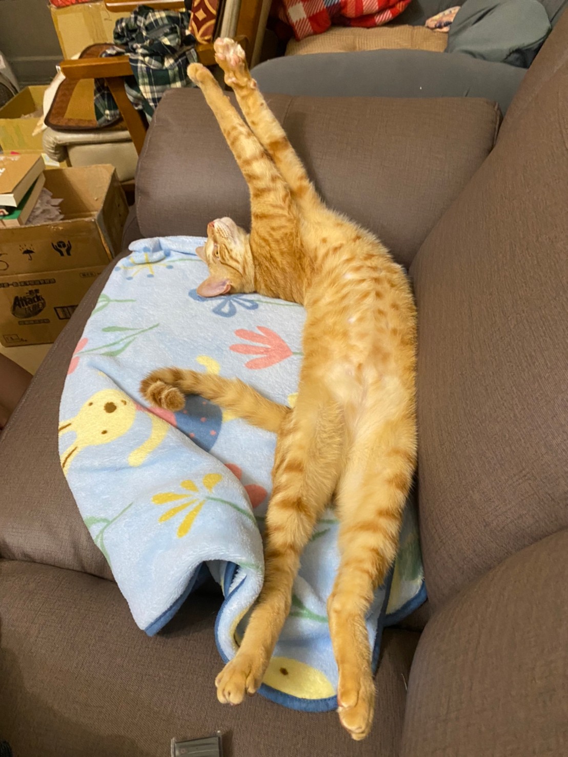 最近新沙發來了。晚上在一樓睡覺都從專屬椅子挪到沙發上睡。還一定要舖他的小被被!