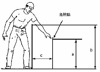 圖一 伸越防護結構。參數包括a:危險點高度,b:防護結構高度,c:至危險點的水平距 離(摘自EN 294)