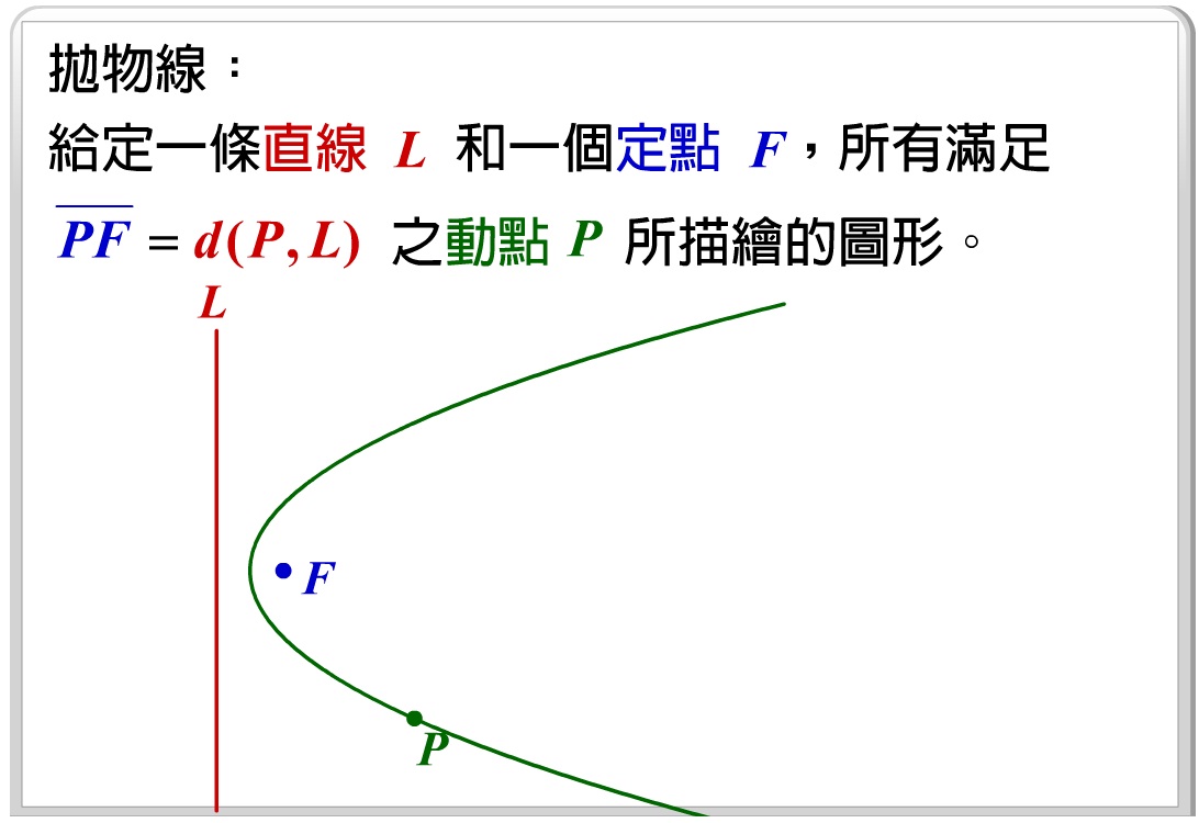 在平面上,與一固定直線L(稱為準線)及線外一定點F(稱為焦點)等距離的所有點P所成的圖形,稱為拋物線