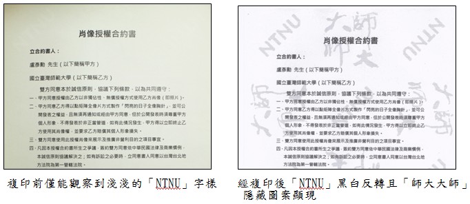 另一款則將文字隱藏於圖片中。肉眼觀看時無法察覺,透過光柵片解密,師大的天空才會浮現「師大大師」的隱藏字樣,達到防偽效果。