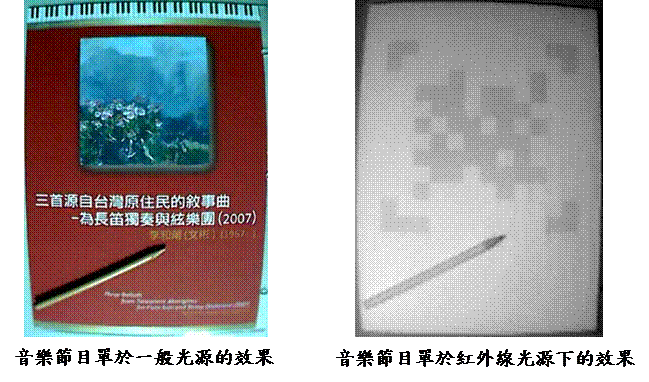 藉由將音訊編碼成二維條碼,運用紅外線浮水印效果隱藏二維條碼於音樂會節目單之中,藉由紅外線光的光學特性,在儀器照射下將條碼解密因而產生音訊,達成互動的效果。此研究有效擴展了紅外線浮水印的應用範圍,對於互動藝術展演、數位學習研發有近一步的突破。