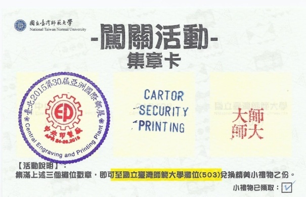 本研究團隊於2015年4月26日至28日於台北世貿三館,參加臺北第30屆亞洲國際郵展,展覽期間展示本聯盟成果「個人化加密郵票」等加值應用產品,並提供第一台個人化加密郵票扭蛋機,讓民眾體驗自動化可變浮水印序號之個人化加密郵票的成果。同時,與法國著名防偽印刷Cartor Security Printing及中央印製廠以聯盟方式進行推廣,除介紹防偽技術之重要性,並有效吸引人潮成為全場焦點。展後已受中華郵政邀約參加2016年我國首次舉辦之世界郵展。
