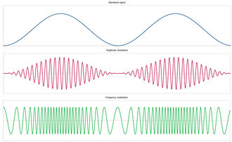 AM, amplitude modulation:sine wave的振幅等於原訊號。 FM, frequency modulation:sine wave的頻率等於原訊號(的倍率、再加一常數)。