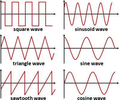 mathematics | engineering -----------------------------| -------------------------- periodic rectanglar function | square wave periodic triangular function | triangle wave periodic linear function | sawtooth wave sinusoidal function | sinusoidal wave / sinusoid sine function | sine wave cosine function | cosine wave